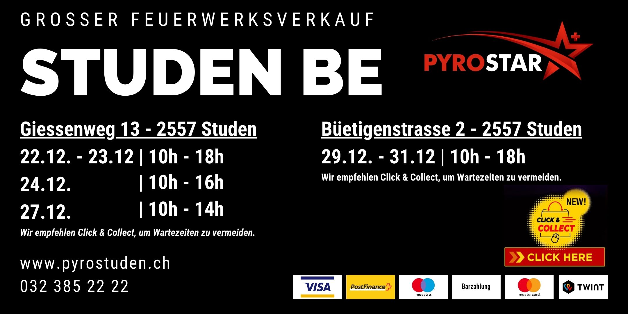 Am 1. August und an Silvester lassen wir es krachen, grosser Verkauf von Feuerwerk an unseren Standorten Studen BE, Neudorf LU, Walterswil SO und Wildegg AG. Bei uns finden Sie ein grosses Feuerwerksortiment für Gross und Klein. Bitte beachten Sie, dass wir an unseren Verkaufsständen nicht das ganze Pyrostar Sortiment anbieten. Wir freuen uns auf Ihren Besuch.